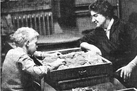 The football game finished and John and Jim spilled into the playroom. A few minutes’ excited conversation about the score, then each settled down with his own psychotherapist, John to build a sand picture of cowboys attacking an Indian encampment in a dense toy forest, Jim to assemble a primitive truck. The three boys ignored each other. They were working, in a world specially designed for children to work in their own way, from which all adults except green-overalled psychotherapists are excluded.